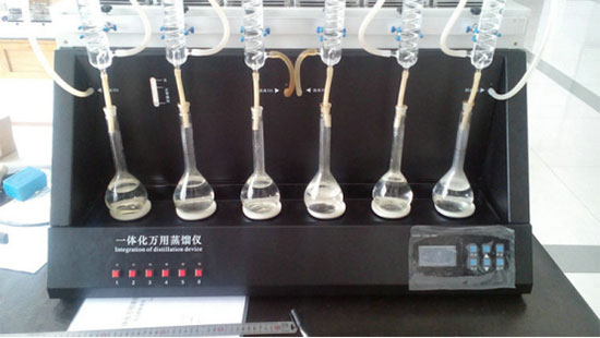 智能一體化蒸餾儀主要由加熱裝置、蒸餾裝置、循環冷卻水裝置和接收裝置四部分組成。加熱裝置設置了加熱速率智能控制功能,可實現加熱溫度和加熱效率精密控制;蒸餾裝置為專利性設計,蒸餾效率高、冷凝效果好;循環冷卻裝置設置了冷卻溫度顯示和控制功能,可確保冷卻效果。接收裝置設置了蒸餾終點檢測和自動停止加熱功能,實現了智能加熱控制。